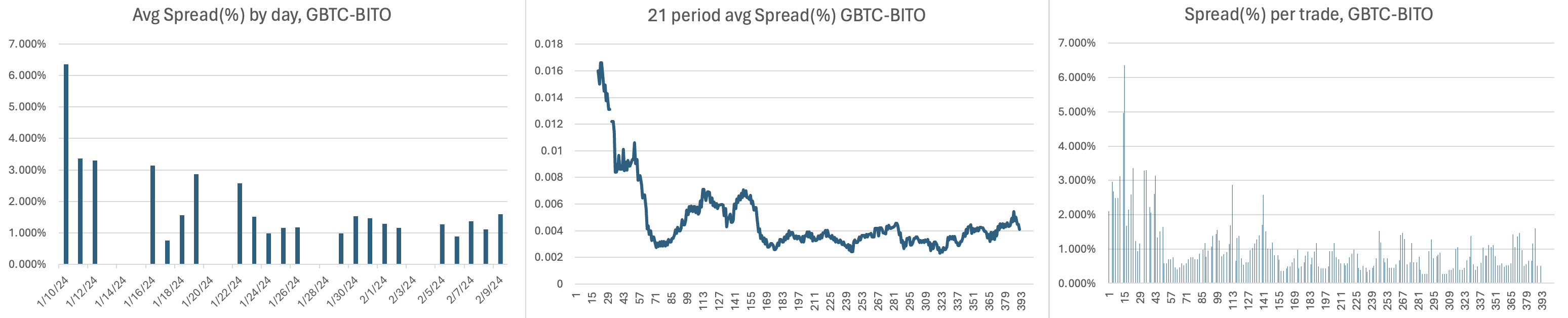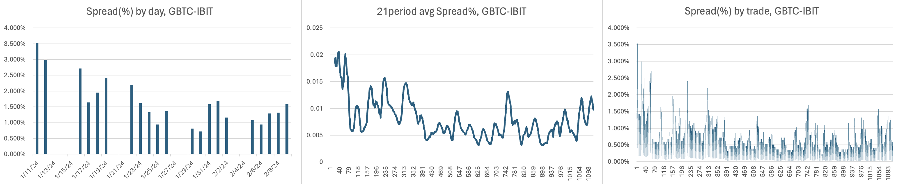 You can also see that after weekends & days off, spreads widen due to increased volatility. This can be attributed to the fact that these ETF’s do not trade over the weekend while Bitcoin & other cryptocurrencies trade 24/7, so BTC price moves over the weekend are only reflected in these ETF’s once the market opens on Monday.
