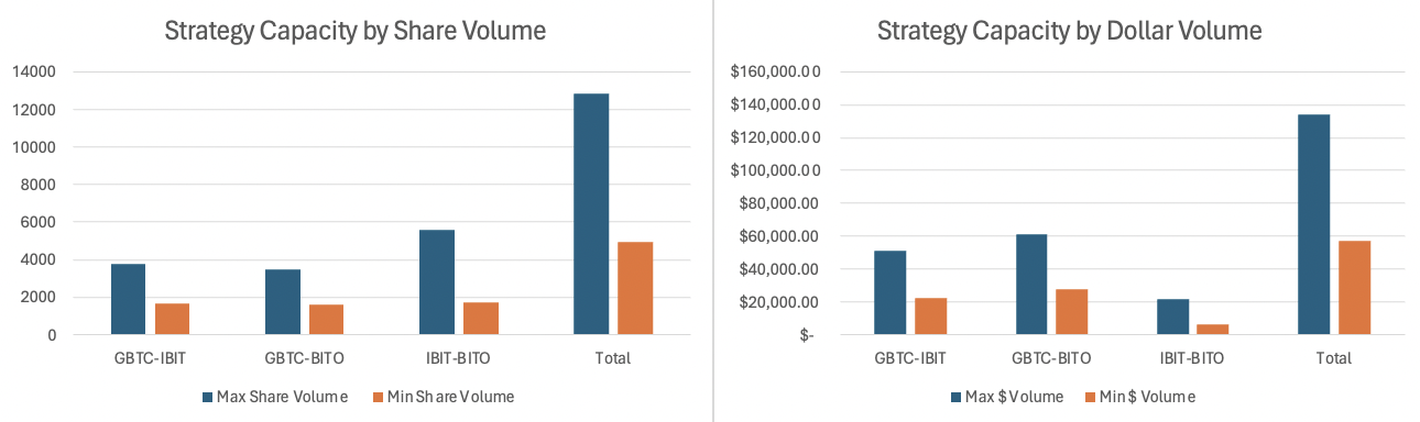 The chart below shows the estimated minimum and maximum volume, per trade, of each strategy: